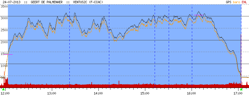Thermiek kwam nogal laat los door hoge temp. Vrij snel hoge basis waardoor alles zonder problemen bereikbaar was. Tijd genomen om wat zaken uit te proberen en enkele routes beter te leren kennen.