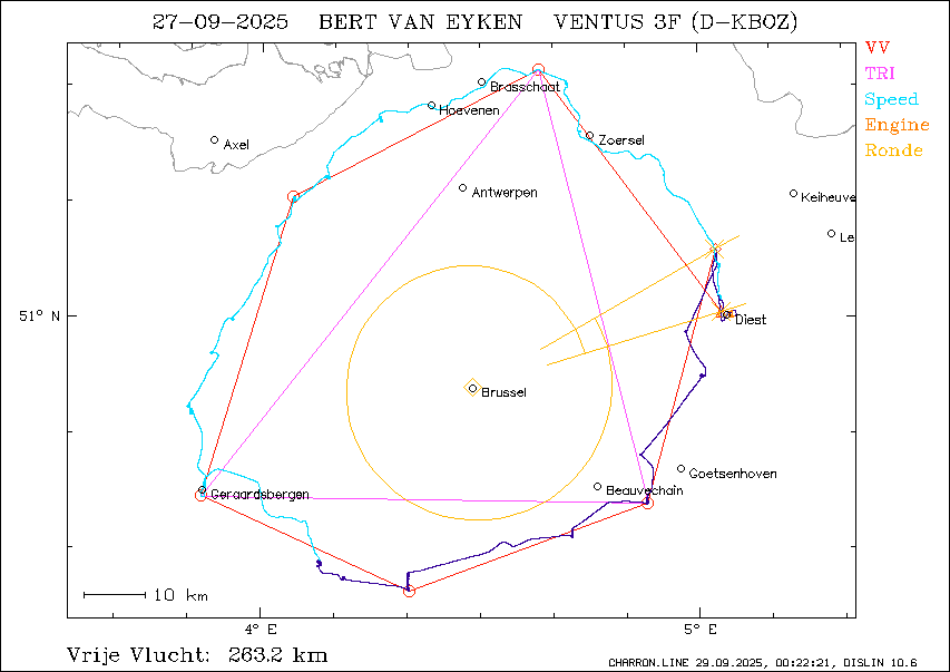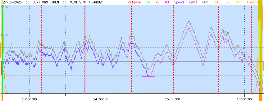 Scoring versie: 24.03 LOGGER GEGEVENS Vlucht datum: 27/09/2025 Piloot: BERT VAN EYKEN Zweefvliegtuig: D-KBOZ Toestel type: VENTUS 3F Klasse: 18-METER Logger type: LX Navigation d.o.o. s/n: fal Logger file: 2025-09-27-LXV-FAL-01.IGC Motor detectie: RPM SAMENVATTING Vluchttijd : 03:39:50 Duurvlucht : 03:35:06 Vrije vlucht : 263.2 km Fasttrack : 81.7 kmh Driehoek : 230.7 km VLUCHTGEGEVENS ALGEMEEN Vliegveld van vertrek EBDT Diest BeNeLux: JA Vertrekpunt pos.: 51°00.329'N 5°04.014'E tijd: 12:35:54 UTC alti: -58 m Ontkoppelpunt pos.: 51°00.104'N 5°03.370'E = 241° 0.9 km van vertrek tijd: 12:36:28 UTC alti: 371 m Landingspunt pos.: 51°00.321'N 5°04.041'E = 115° 0.0 km van vertrek tijd: 16:15:44 UTC alti: -55 m Afstand take-off tot landing: 0.0 Totale vluchtduur: 03:39:50 Motorgebruik aantal keren: 2 totale motortijd: 2.5 min VRIJE VLUCHT ANALYSE Keerpunten vrije vlucht optimalisatie: 7 Start : 51°00.542'N 5°03.124'E @ 12:37:22 UTC, 385 m punt 1: 51°21.570'N 4°38.149'E @ 13:09:52 UTC, 719 m punt 2: 51°10.492'N 4°04.260'E @ 13:46:23 UTC, 809 m punt 3: 50°44.618'N 3°51.799'E @ 14:25:30 UTC, 851 m punt 4: 50°36.458'N 4°20.283'E @ 15:00:43 UTC, 459 m punt 5: 50°43.983'N 4°52.947'E @ 15:38:23 UTC, 741 m Finish: 51°05.916'N 5°02.442'E @ 16:05:49 UTC, 397 m Benen vrije vlucht optimalisatie been 1: 48.7 km 323° @ 89.8 km/h been 2: 44.5 km 243° @ 73.0 km/h been 3: 50.1 km 197° @ 76.9 km/h been 4: 36.8 km 114° @ 62.7 km/h been 5: 40.9 km 70° @ 65.2 km/h been 6: 42.2 km 15° @ 92.2 km/h Afgelegde afstand: 263.2 km Duur: 03:28:27 Gemiddelde snelheid: 75.7 km/h Afst. start - vliegveld van vertrek: 1.1 km Afst finish - vliegveld van vertrek: 10.5 km Starthoogte: 385.0 m Finishhoogte: 397.0 m Hoogteverlies vrije vlucht: -12 m Totale score afstand: 263.2 km BESTE SNELHEIDSTRAJECT ANALYSE Duur van snelheidscompetitie: 2 uur Startpunt pos.: 51°01.648'N 5°03.177'E = 338° 2.6 km van vertrek tijd: 12:39:40 UTC alti: 455 m Finishpunt pos.: 50°39.087'N 4°08.074'E = 239° 76.6 km van vertrek tijd: 14:39:40 UTC alti: 252 m Grootste afstand in 2 uur: 163.4 km Beste snelheid in 2 uur: 81.7 km/h Hoogteverlies: 203 m OPGEGEVEN PROEF ANALYSE Minimaal toegelaten lengte van de benen: 10 km Opgegeven proef: 207.5 km GELDIG vertrek: 0°00.000'N 0°00.000'E start: ZUTENDAAL KERK 50°55.900'N 5°34.400'E punt 1: NEDERWEERT 51°16.580'N 5°45.790'E 40.6 km 19° punt 2: KAMP LINTFORT AERO 51°31.770'N 6°32.170'E 60.7 km 62° punt 3: BERINGE NL 51°20.350'N 5°56.570'E 46.4 km 243° punt 4: AS 51°00.326'N 5°34.576'E 45.1 km 215° finish: HASSELT KIEWIT 50°58.200'N 5°22.500'E 14.7 km 254° landing: 0°00.000'N 0°00.000'E Keerpunten gerond en afgelegde afstand start: NIET GEROND Proef NIET GELUKT Afgelegde afstand: 0.0 km Duur van de proef: 00:00:00 Gemiddelde snelheid: 0.0 km/h Start hoogte: 0 m Hoogte passeren start: 385 m Hoogte aan break-punt: 0 m Hoogteverlies over proef: 0 m Totale score afstand: 0.0 km DRIEHOEK ANALYSE Been 0: 87.2 km Been 1: 71.7 km Been 2: 71.8 km Totaal: 230.7 km DUURVLUCHT ANALYSE Blok langste zweefvlucht begin: 12:37:22 UTC einde: 16:12:28 UTC duur: 03:35:06 HOOGTEWINST ANALYSE Blok grootste hoogtewinst laag punt: 235 m @ 14:39:29 UTC hoog punt: 1092 m @ 15:13:41 UTC hoogtewinst: 857 m CHARRONDE ANALYSE Eerste punt: 12:37:22 bearing 73.0° Tweede punt: 16:05:54 bearing 60.3° Totale hoek: -372.7° MELDINGEN EVALUATIEPROGRAMMA Rekentijd 4149