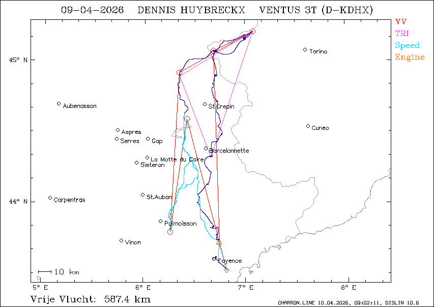 pos.: 44°37.881'N 6°23.962'E = 348° 115.9 km van vertrek